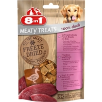 8in1 Meaty Treats Eend 8in1 Meaty Treats, heerlijke snacks voor jouw huisdier! Het recept met 100% eendenborst zit boordevol met het goede van vlees! De ingrediënten zijn op milde wijze gevriesdroogd om al het goede en de echte smaak van vlees te behouden. * Freeze Dried Meaty Treats met eend * Al het goede van vlees behouden * Geen suiker, geen kleurstoffen, geen smaakversterkers, geen conserveermiddelen, geen ggo’s * Gluten- en graanvrij recept * Vetarm (Plein.nl)