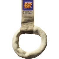 BF Petfood Dental Ring SmallDe BF Petfood Dental Ring Small is een natuurlijke, hoogwaardige en ambachtelijk gemaakte kauwrol. De rol kluiven bevatten geen chemische anti-oxidanten ter"verbetering"van de uitstraling of de smaak. Het gebruik van de gedroogde ongelooide binnenste huidlaag (=rawhide) van runderen als basismateriaal geeft de hond lang(er), lekker en nuttig kauwplezier.Tijdens het kauwen wordt endorfine aangemaakt, dit zorgt voor een rustig gevoel, waardoor de hond zich (meer) ontspant. Daarnaast zorgt de dental rol voor een optimale gebitsverzorging, de rol zorgt voor minder tandplak en tandsteen. * Optimale gebitsverzorging, anti-tandplak en tandsteen * Bevat geen lichaamsvreemde stoffen of toevoegingen * Dikke(re) rawhide huid en betere acceptatie * Hypoallergeen (alleen rund) en lang(er) kauwplezier * Bevat geen koolhydraten (Petgamma.com)
