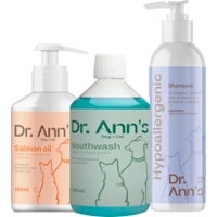 Dit pakket bevat drie verzorgingsproducten die elkaar perfect aanvullen: zalmolie voor ondersteuning van binnenuit, een milde shampoo voor de gevoelige huid, en mondwater dat bijdraagt aan een frisse adem en een gezond gebit. (Medpets.nl)