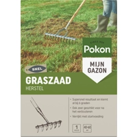 Pokon Graszaad HerstelPokon Graszaad Herstel is geschikt voor het herstel van je gazon, zowel van kale plekken als na het verticuteren. Met dit speciale SOS-graszaad wordt je gazon weer supersnel egaal groen. Het graszaad kiemt al na 1 week, zelfs bij een bodemtemperatuur van 6°C. Pokon Graszaad Herstel is ideaal als snelle oplossing, ook in de herfst- en wintermaanden. Voor een optimale ontkieming is het van belang dat de grond niet te koud is (+6°C.) en dat de buitentemperatuur hoger is dag 15°C (max 25°C). Zaai in een vochtige grond en bij windstil weer. Wanneer ergeen regen is gevallen, besproei dan eerst de grond. Zaai het graszaad gelijkmatig en niet te dicht op elkaar, dit belemmert de ontwikkeling. Kiemduur is 1 tot 2 weken, afhankelijk van lucht- en bodemtemperatuur en hoeveelheid vocht. Zorg ervoor dat de grond na het zaaien de eerste 2 tot 4 weken vochtig blijft door voorzichtig en gelijkmatig te sproeien. Droogt de bovenlaag uit, dan mislukt de kieming of sterven de kleine grasplantjes af. * Pokon Graszaad Herstel is speciaal ontwikkeld voor het snel en effectief herstellen van kale plekken en na het verticuteren van je gazon. * Het graszaad kiemt al na 1 week, zelfs bij een bodemtemperatuur van 6°C, waardoor je snel resultaat zult zien. * Dit graszaad is ook geschikt voor gebruik in de herfst- en wintermaanden, waardoor je het hele jaar door je gazon kunt herstellen. (Plein.nl)