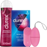 Spannend Valentijn PakketMet dit spannende Valentijn pakket kun jij je geliefde verrassen in de slaapkamer. Het pakket bevatéén pakje Durex Love Condooms, één Durex Play Glijmiddel met de smaak Crazy Cherry én een Vibrerend Ei van Easytoys. De condooms zijn standaard Durex condooms en bevatten glijmiddel. * Het perfecte valentijn cadeautje voor koppels * Voor vaginale, anale of orale seks * Met afstandsbediening waarmee je de tien vibratie standen kan bedienen * De condooms zijn snel en gemakkelijk om te doen (Plein.nl)