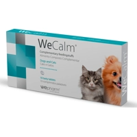 Wepharm WeCalm tabletten kunnen gegeven worden om je hond of kat te ondersteunen tijdens stressvolle situaties en bij gespannen gedrag. Denk hierbij aan vuurwerkangst, reizen of ongewenst gedrag. (Medpets.nl)