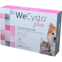 Wepharm WeCysto Plus is een aanvullend diervoeder voor honden en katten. Het draagt bij aan het behoud van een gezonde blaasfunctie en ondersteunt de blaaswand, zodat bacteriën zich minder makkelijk kunnen hechten en met de urine afgevoerd worden. Het product is eenvoudig dagelijks door het voer te geven. (Medpets.nl)