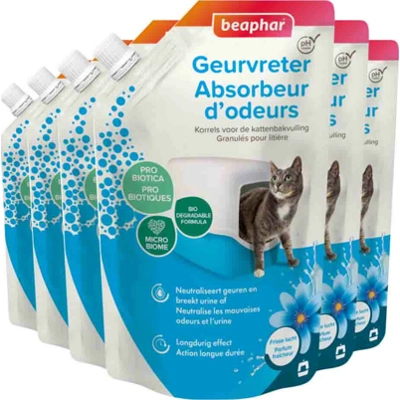 Beaphar GeurvreterBeaphar Geurvreter zorgt voor een blijvend frisse kattenbak. Geurvreter neemt de urine direct op. De unieke structuur van de korrel kapselt de urine in. Hierdoor kan de geur niet meer ontsnappen. Vervolgens worden urine en geur door natuurlijke bacteriën afgebroken. Door dit proces blijft de kattenbak hygiënisch en wordt de levensduur van de kattenbakvulling tot 2 x toe verlengd. * Zorgt voor een blijvend frisse kattenbak * Biologisch afbreekbaar en volledig veilig voor katten * De unieke structuur van de korrel kapselt de urine in (Plein.nl)