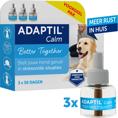 Adaptil Anti-stress NavulflaconsDe Adaptil anti-stress navulling bevat het zogenaamde Dog Appeasing Pheromone, of kortweg moederferomoon. Een stof waardoor je hond minder stress gaat ervaren. Dit feromoon is een geruststellende boodschap en helpt puppy’s te kalmeren en gerust te stellen. Het geeft een sterk gevoel van veiligheid en comfort. De Adaptil Anti-Stress Verdamper is geschikt voor gebruik tijdens vuurwerk of andere stressvolle situaties. Gebruik de navullingen om je huis een warm en veilig thuis te blijven maken voor jouw honden. Deferomonen geven vertrouwen en rust aan pups, de feromonen verhogen de leercapaciteit en bevorderen het vormen van een band tussen teef en pups. Ook bij oudere honden heeft het feromoon dezelfde geruststellende eigenschappen. * De verdamper helpt je om je relatie met jouw hond(en) goed te houden,door een liefdevolle leefomgeving voor hen te creëren en van uw huis een warm en veilig thuis te maken * Snelle en eenvoudige oplossing die je hond kan helpen ontspannen zonder hem te versuffenElke verdampernavulling bestrijkt een gebied van 50 tot 70 m2 * Een natuurlijk product waarvan bewezenis dat het zowel pups als volwassen honden op hun gemak stelt (Plein.nl)