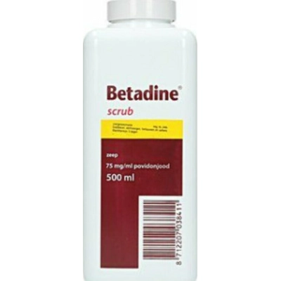 Betadine Scrub 500 mlBetadine Scrub is een vloeibare milde desinfecterende zeep zonder korreltjes. Betadine Scrub is geschikt voor het onschadelijk maken van bacteriën, schimmels en virussen. De werkzame stof in alle Betadine varianten is povidonjodium. Dit is een speciaal soort jodium dat niet prikt, maar wel goed desinfecteert. Het is daarom een prettig middel om te gebruiken en zeer kindvriendelijk. * Geschikt voor het desinfecteren van handen en huid* Maximale gebruikstermijn na opening is ongeveer 1 jaar * Maakt bacteriën, schimmels en virussen onschadelijk * Geschikt voor de behandeling van waterwratjes * Prikt niet (Plein.nl)