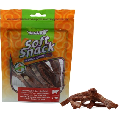 Braaaf Beef Steak Slice - Rund en vis is een heerlijke zachte snack voor honden met de smaken rund en vis. Dit product is tijdelijk niet verkrijgbaar. Een vergelijkbaar alternatief zijn de Braaaf Beef Steak Cubes. (Medpets.nl)