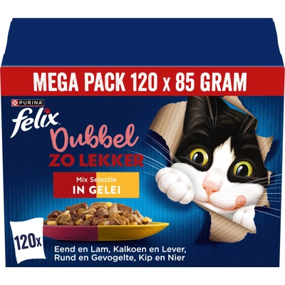 Daar kun je even mee vooruit: Het Voordeelpakket Felix "As good as it looks" bevat 120 porties fijn kattenvoer en is de perfecte keuze voor huishoudens met meerdere katten. Er is ook afwisseling in de voerbak, want het mixpakket bevat natvoer in vier heerlijke smaken. Niet alleen de hoeveelheid is overtuigend, maar ook wat erin zit: Felix "As good as it looks" bestaat uit fijne stukjes vlees of vis geserveerd in een smakelijke gelei. Ze bevatten onder andere belangrijke vitaminen en omega-6 vetzuren. Bij de bereiding worden geen kunstmatige smaak- of kleurstoffen of conserveringsmiddelen gebruikt. Dit zijn gezonde en evenwichtige recepten die ideaal zijn voor de dagelijkse voeding van je kat . Voordeelpakket Felix "As good as it looks" Gelei 120 x 85 g in één oogopslag: Mixpakket natvoer voor volwassen katten. Perfect om in te slaan: 120 verse zakjes met 4 gevarieerde soorten, geschikt voor huishoudens met meerdere katten. Natuurlijk lekker: fijne stukjes vlees of vis, gepresenteerd in smakelijke gelei Met waardevolle ingrediënten: bron van omega-6 vetzuren en vitamine D E Rijk aan vitale stoffen: voor een complete voeding, bevat belangrijke mineralen sporenelementen Compleet voor elke dag: dekt de dagelijkse behoefte van je kat met alle belangrijke voedingsstoffen Zonder kunstmatige kleurstoffen, smaakversterkers conserveringsmiddelen Gemakkelijk te portioneren: praktische scheur-open zakjes voor plezier versheid bij elke maaltijd Gemengde variatie: 30 x rund 30 x kabeljauw 30 x tonijn 30 x kip Vismix pakket 1: 30 x tonijn 30 x zalm 30 x kabeljauw 30 x koolvis Vismixpakket 2: 30 x tonijn 30 x zalm 30 x kabeljauw 30 x Koolvis Vlees Mixpakket 1: 30 x rundvlees 30 x kip 30 x eend 30 x lam Vlees Mixpakket 2: 30 x rundvlees 30 x zalm 30 x kip 30 x tonijn Dubbel Zo Lekker: 30 x rund gevogelte 30 x kalkoen lever 30 x kip nier 30 x Eend Lam Senior: 30 x Rundvlees 30 x Zalm 30 x kip 30 x tonijn (Zooplus.nl)