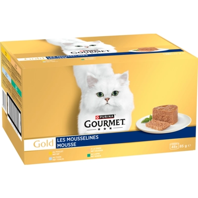Gourmet Gold Kattenvoer Blik Mousse Multipack Kip&Tonijn&Kalkoen&KonijnGourmet Gold Mousse biedt jouw kat een verfijnde en onweerstaanbare smaakbeleving. De zachte mousse is zorgvuldig bereid met hoogwaardige ingrediënten en verkrijgbaar in heerlijke varianten met kip, tonijn, kalkoen en konijn. Elke portie heeft een fluweelzachte textuur die smelt op de tong en zelfs de meest kieskeurige kat weet te bekoren. Deze luxueuze maaltijd combineert delicate smaken met de kwaliteit die jij van Gourmet mag verwachten.Zonder toegevoegde kleurstoffen, kunstmatige smaakstoffen of conserveermiddelen biedt Gourmet Gold Mousse pure verwenning in elke hap. Zo geniet jouw kat dagelijks van een zachte, smaakvolle maaltijd vol verfijnde klasse. * Zachte mousse met luxueuze textuur * Met kip, tonijn, kalkoen en konijn* Zonder kunstmatige toevoegingen (Plein.nl)