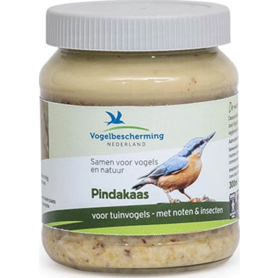 Vogelbescherming Nederland Vogelpindakaas met noot en insecten is speciaal ontwikkeld voor vogels.Voor tuinvogels kan pindakaas een welkome aanvulling zijn als voedselbron, vooral in de koude wintermaanden. Pinda's zijn namelijk zeer calorierijk en voedzaam. Pindakaas voor mensen bevat echter teveel zout voor vogels. Daarom is vogelpindakaas een gezond alternatief. Vogelpindakaas biedt wel de voedingswaarde maar niet het zout.Deze variant is nog extra verrijkt met stukjes noot en insecten. (Voormijndier.nl)