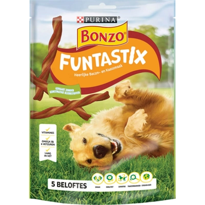 Home > Overige > Bonzo > Purina Bonzo Funtastix hondensnacks met bacon- en kaassmaak (175 gr) 3 verpakkingen
