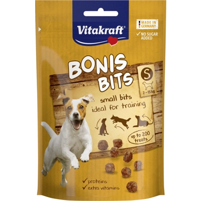 Vitakraft Bonis BitsDe extra kleine Boony Bits zijn ideaal als snack voor kleine honden of als trainingssnack. Het zijn lekker luchtige, vlezige mini-hapjes voor alle honden, die niet kruimelen en vet zijn. Minimaal 200 stuks per verpakking. De Boony Bits zijn volgens suikervrije receptuur bereid en bevatten extra vitamines. * Ideaal tijdens de training * Kruimelen niet en zijn niet vet * Met extra vitamines * Suikervrije receptuur * In hersluitbare verpakking (Plein.nl)