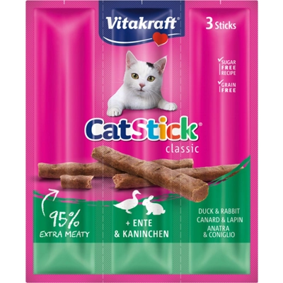 Vitakraft Cat Stick Mini - Eend & Konijn is een lekkere snack voor jouw kat. Deze sticks zijn gemakkelijk te breken door de groeven en ze zijn gemaakt van 95% vlees! (Medpets.nl)